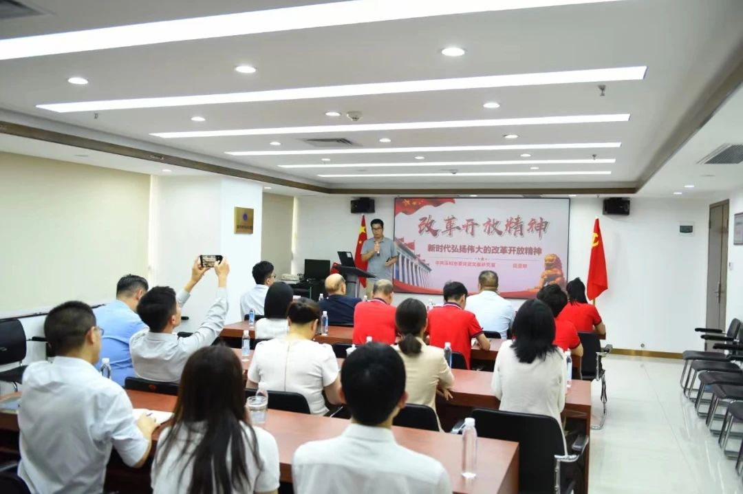 随后,国晖律所特别邀请了深圳市委党史文献研究室党史处蓝贤明副处长到6楼党群活动室为全体党员讲授以“新时代弘扬伟大的改革开放精神”为主题的党课。